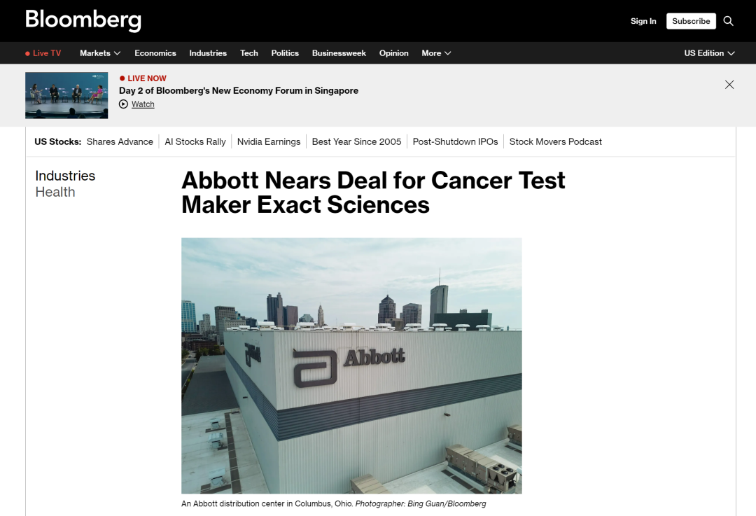 据海外媒体昨日报道,医疗健康巨头雅培(Abbott)正计划收购癌症诊断技术开发商 Exact Sciences(以下简称“Exact”)。