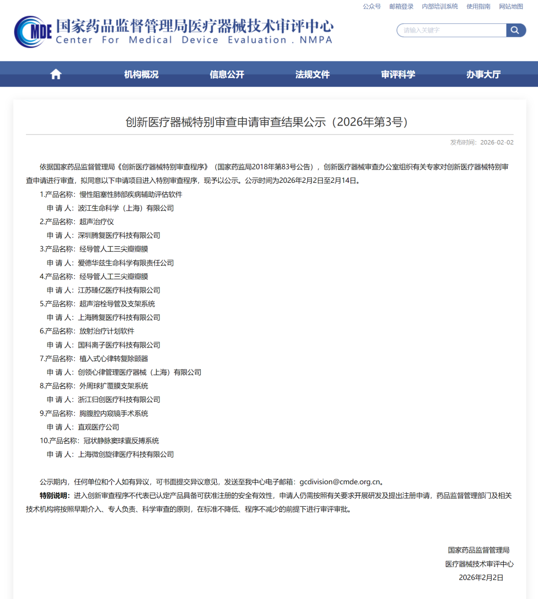 创新医疗器械特别审查申请审查结果公示(2026年第3号)