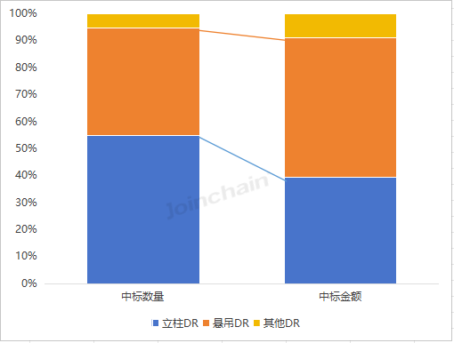 从各类型DR的中标情况分布来看,悬吊及立柱DR仍为采购主要类型,占总中标金额超95%。