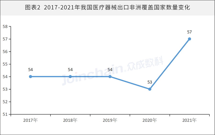 根据中国海关总署公布的贸易数据,我国医疗器械出口非洲覆盖国家一直稳定在53-57个。