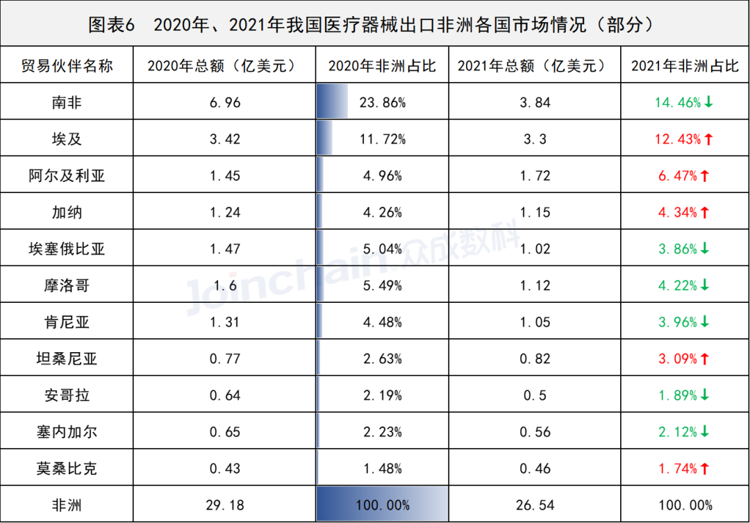 在各国出口市场方面,出口南非的医疗器械商品约3.84亿美元,位于榜首,占非洲总出口额的14.46%,较2020年占比明显下降。随后埃及、尼日利亚、阿尔及利亚和加纳的出口金额分别以3.30、3.10、1.72、和1.15亿美元,位居前五,其中埃及、阿尔及利亚和加纳的出口市场较2020年略有扩大。