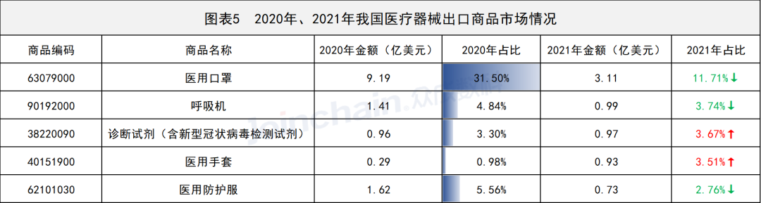 2021年我国医用口罩出口非洲贸易额达3.11亿美元,较2020年占比均有明显下降,呼吸机出口贸易额达0.99亿美元。相比之下,诊断试剂和医用手套出口占比均有提升。