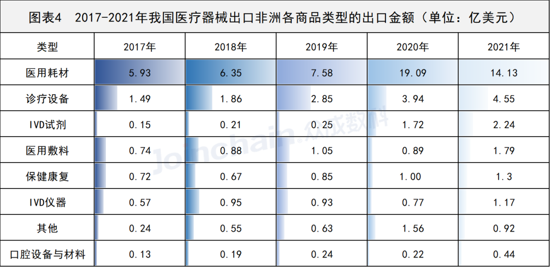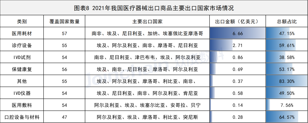 根据中国海关总署公布贸易伙伴数据,2021年口腔设备及材料、其他消毒及实验器具等专业度高的商品需求国家较为集中,短时间内难以完全打开非洲市场。而受新冠疫情和当地医疗卫生的影响,医用耗材及IVD试剂各国需求大,出口市场较为宽广。