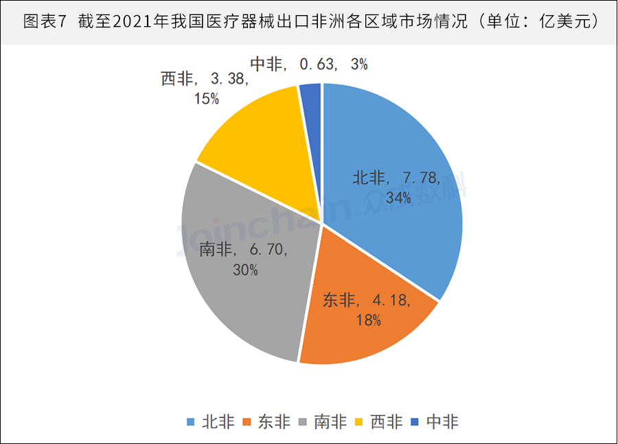 在区域出口市场方面,北非和南非地区的医疗器械出口市场,占非洲总出口市场的64%,位于第一梯队。东非、西非地区出口市场,占非洲总出口市场的33%,位于第二梯队。相比之下,中非地区医疗器械市场较小。