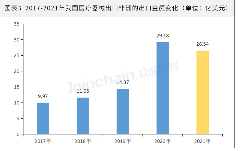 即使在疫情肆虐下,非洲的贸易需求仍然强劲。中国海关总署发布的最新数据显示,2021年中非双边贸易总额达2543亿美元,同比增长35.3%,但医疗器械贸易额仍然比较低,仅26.54亿美元。