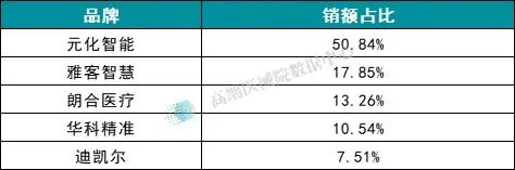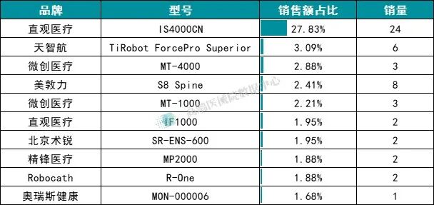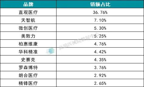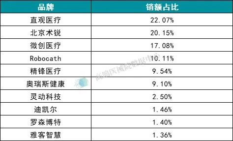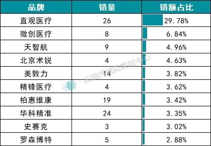 而天智航、微创医疗等国产品牌则呈分散布局状态,各凭单一型号分食市场小份额,销额占比均低于 7%,暂未出现能匹敌直观医疗单品的爆款产品。