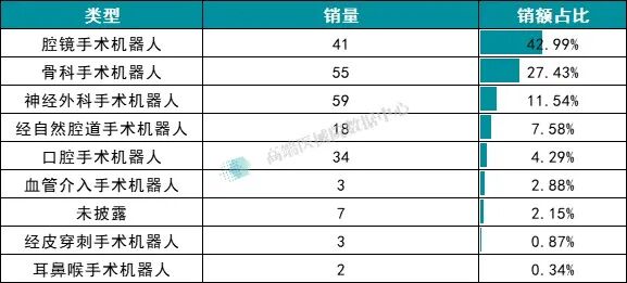 而神经外科手术机器人、口腔手术机器人则呈现出 “销量领先但销额占比偏低” 的特点,这一差异的核心是其单台设备价值
