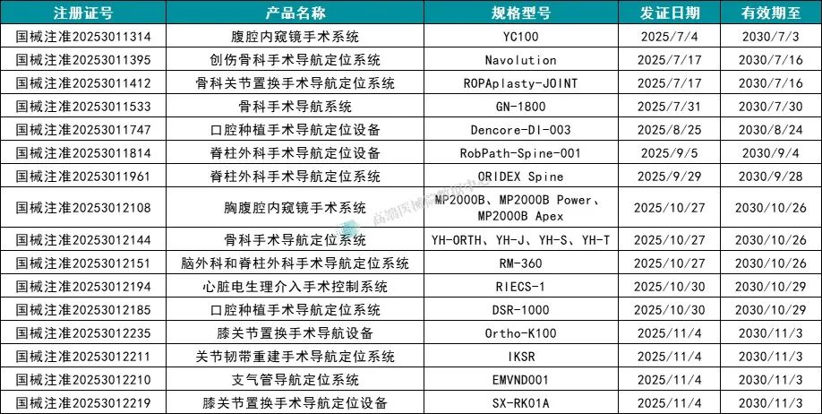 2025年7月-11月手术机器人NMPA获批情况