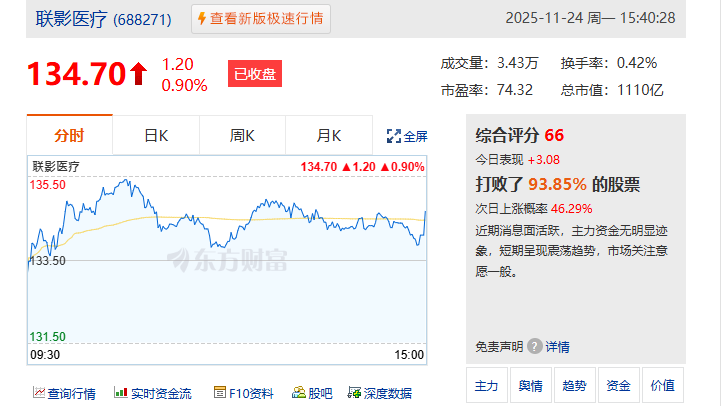 截至11 月 24 日 收盘,其实时股价 134.7 元,涨 0.9%,总市值 1110 亿元,市盈率(TTM)74.32 ,这一估值水平高于医疗器械行业平均,既反映市场对其国产替代龙头地位的认可,也隐含对后续业绩增速能否匹配高估值的观望。