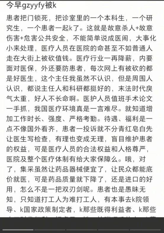 另有自媒体发文表示,另有一名本科实习生和研究生以及一名患者被袭击波及。