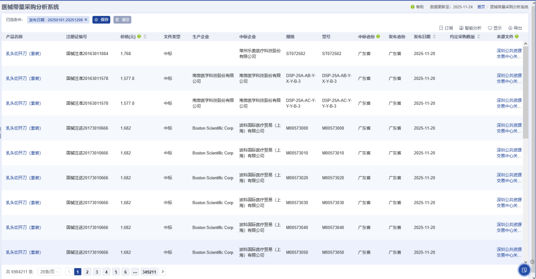 不仅江西省,从2025年耗材集采趋势来看,耗材集采扩围提质再加速。据药智医械数据-医械带量采购分析系统数据库查询显示,截至11月24日,已收录6984211条集采信息,采购数量达到4.08亿,采购金额达到706.35亿元