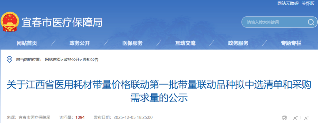 近日,宜春市医疗保障局发布关于江西省医用耗材带量价格联动第一批带量联动品种拟中选清单和采购需求量的公示(以下简称《公示》),拟中选清单及采购需求量清单已公布。(文末点击阅读原文了解详情)