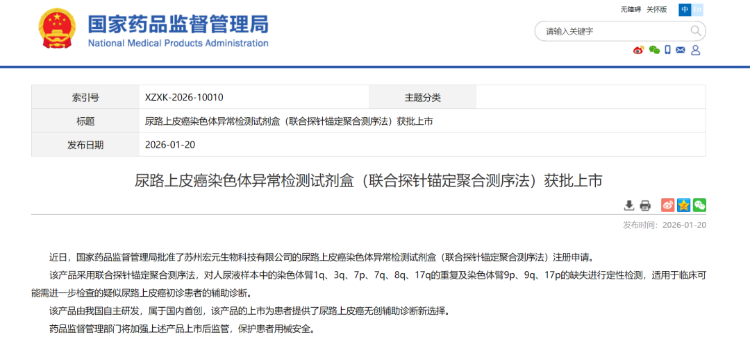 近日,国家药监局批准了苏州宏元生物“尿路上皮癌染色体异常检测试剂盒”的注册。这款采用联合探针锚定聚合测序法的产品,通过分析尿液中9个关键染色体臂的异常,为尿路上皮癌的初诊提供了全新的无创辅助诊断选择。