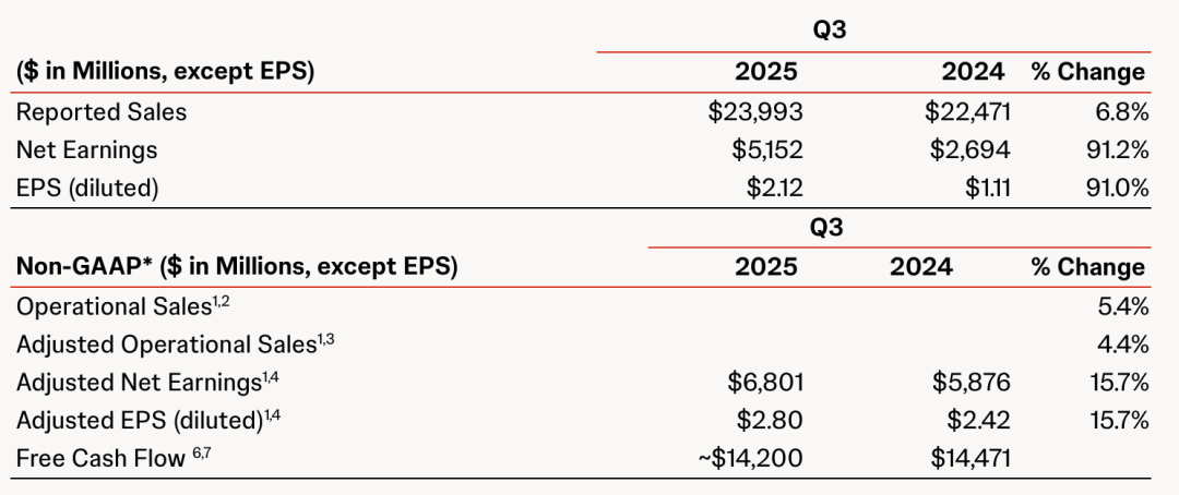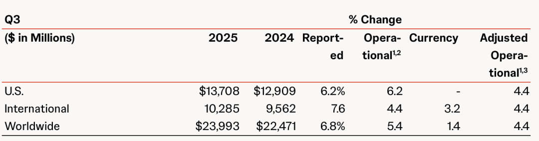 2025年第三季度,强生实现全球销售额240亿美元(约合人民币1710亿),同比增长6.8%(报告口径)/ 5.4%(运营口径),高于市场预期的231.7亿美元。美国市场贡献137亿美元,同比增长6.2%;国际市场销售额103亿美元,同比增长7.6%(运营+4.4%)。
