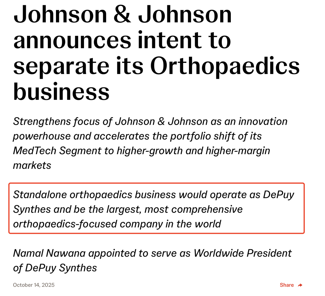 2025年10月14日,强生公司(Johnson & Johnson,NYSE: JNJ)发布了2025年第三季度财报,同时宣布将把其骨科业务 DePuy Synthes分拆为一家独立公司。