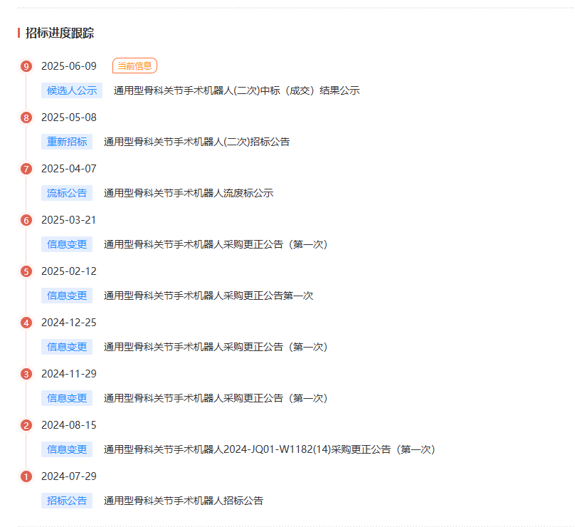 2025 年 6 月 9日,军队医疗机构通用型骨科关节手术机器人集采结果揭晓,中国新兴进口有限责任公司以 1080 万元 / 3 台的报价中标,较 3000 万元的招标预算直降 64%,单价低至 360 万元 / 台。