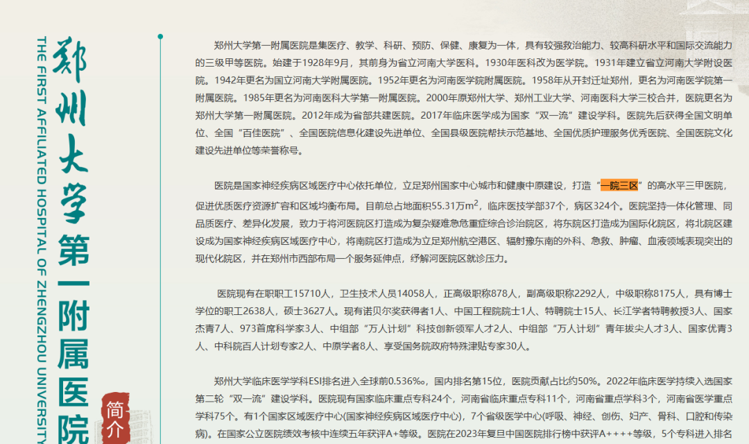 目前,郑大一附院官网介绍,医院是国家神经疾病区域医疗中心依托单位,立足郑州国家中心城市和健康中原建设,打造“一院三区”的高水平三甲医院,促进优质医疗资源扩容和区域均衡布局。