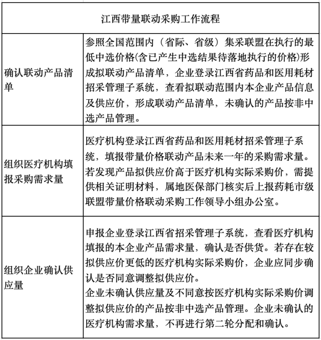 根据《工作方案》,已有省际联盟或省级联盟(包含市级联盟全省执行)的集中带量采购中选结果,而江西省未集采的部分品种,将按入带量价格联动采购。采购工作分批次开展,采购周期为一年。