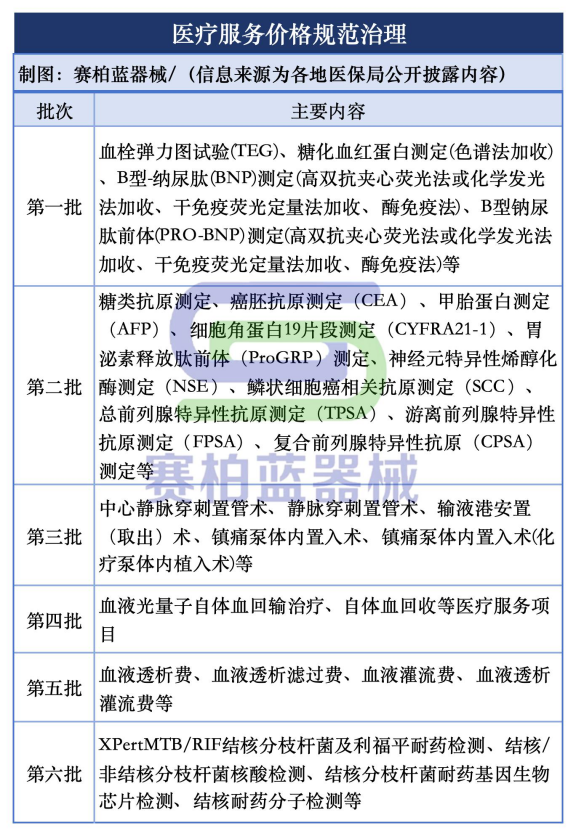 值得关注的是,截至目前的六批医疗服务价格规范治理中,三批都将焦点放在了检验项目上。除上述项目外,还涉及血栓弹力图试验(TEG)、糖化血红蛋白测定(色谱法加收)、B型-纳尿肽(BNP)测定、B型钠尿肽前体(PRO-BNP)测定、糖类抗原测定、癌胚抗原测定(CEA)、甲胎蛋白测定(AFP)等诸多内容。