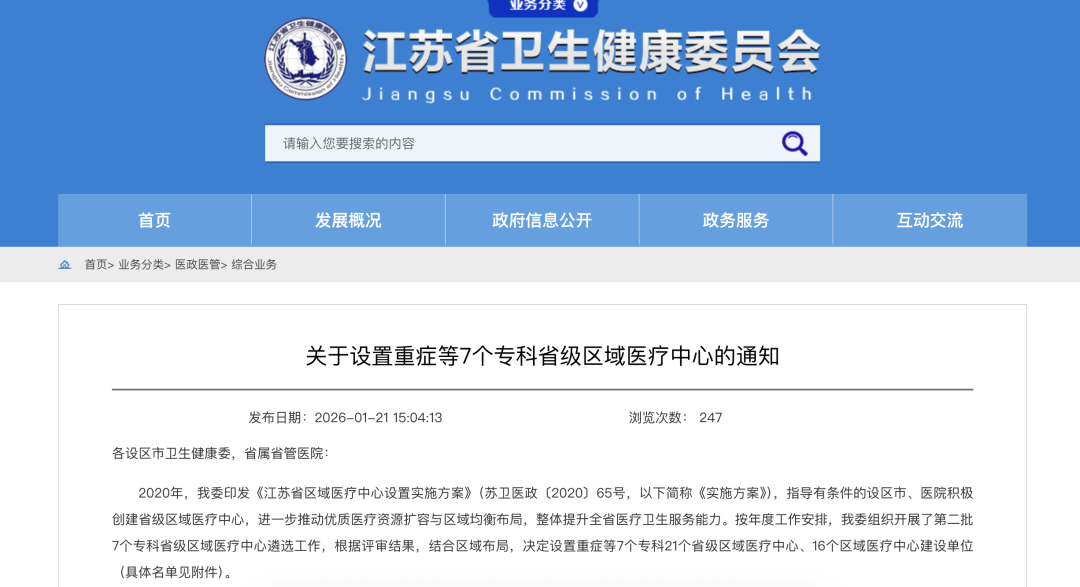 近日,江苏省卫健委官网印发《关于设置重症等7个专科省级区域医疗中心的通知》,通知提出,2020年,江苏省卫健委印发《江苏省区域医疗中心设置实施方案》,指导有条件的设区市、医院积极创建省级区域医疗中心,进一步推动优质医疗资源扩容与区域均衡布局,整体提升全省医疗卫生服务能力。