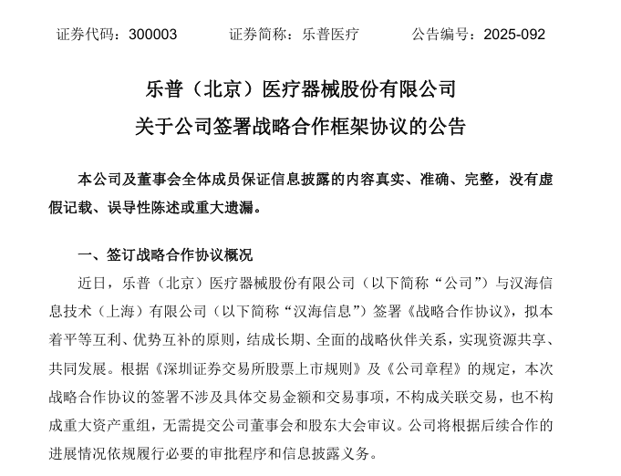 9月22日,A股市场“心血管第一股”乐普医疗发布公告称,公司将与汉海信息技术(上海)有限公司(以下简称“汉海信息”)签署《战略合作协议》,拟本着平等互利、优势互补的原则,结成长期、全面的战略伙伴关系,实现资源共享、共同发展。该合作将为乐普医疗医美板块销售新增线上合作渠道,与现有线下销售渠道(经销商、核心 KA)形成互补,构建全渠道销售网络。据悉,汉海信息是美团在上海的核心主体公司,是美团网及大众点评网的合法经营者,拥有完整的平台自主经营权益。
