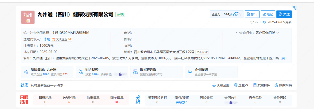 据悉,近日,九州通(四川)健康发展有限公司成立,法定代表人为李娲,注册资本为1000万元,经营范围包含:供应链管理服务;第二类医疗设备租赁;第二类医疗器械销售;电子专用设备销售;电子产品销售;家具销售;汽车销售等。企查查股权穿透显示,该公司由九州通(600998)旗下九州通医疗器械集团有限公司等共同持股。