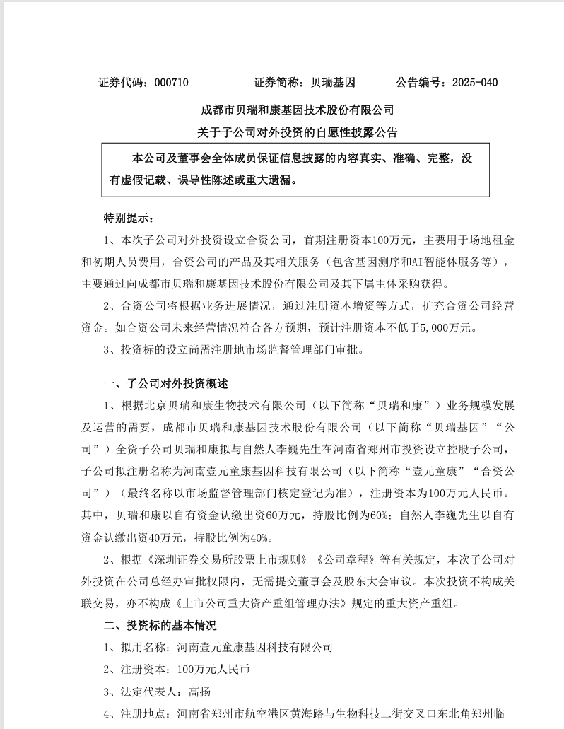 贝瑞基因(000710.SZ)近日发布公告称,旗下全资子公司北京贝瑞和康生物技术有限公司(以下简称"贝瑞和康")与首都医科大学附属北京儿童医院李巍教授达成战略合作,拟在郑州市共同出资组建河南壹元童康基因科技有限公司(暂定名)。根据协议安排,合资公司注册资本100万元,其中贝瑞和康以自有资金出资60万元持有60%股权,李巍教授出资40万元持有40%股权。