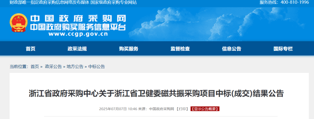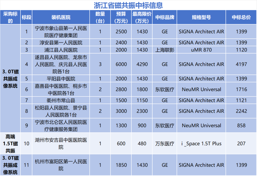 7月7日,浙江省卫健委磁共振集采项目结果出炉,总预算约2.6亿元的采购大单中,GE医疗一举拿下10台3.0T磁共振,占14台3.0T磁共振采购总量的71%。加上此前CT等设备的集采结果,GE在浙江总中标金额已超3.7亿元,已形成压倒性优势。