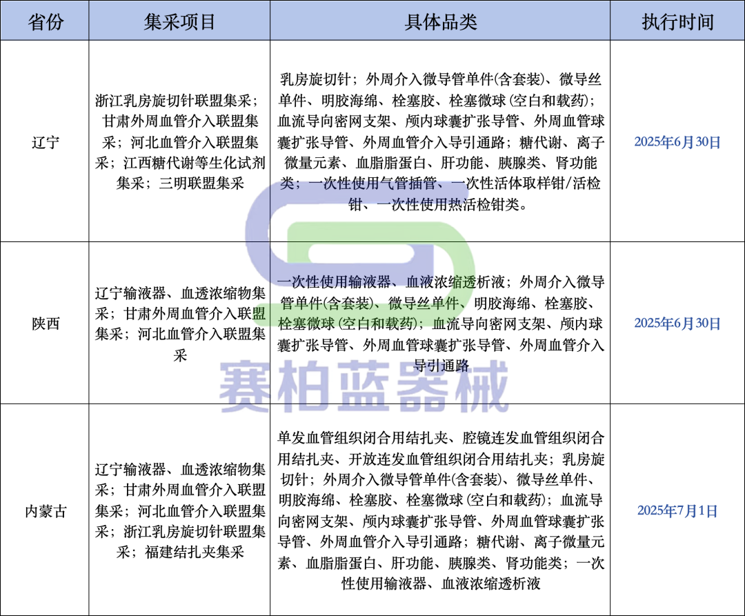 根据《通知》,辽宁将于2025年6月30日起落地一批省际联盟集采,包括浙江乳房旋切针、甘肃外周血管介入、河北血管介入类、江西糖代谢等试剂、三明一次性耗材等联盟集采的中选结果。