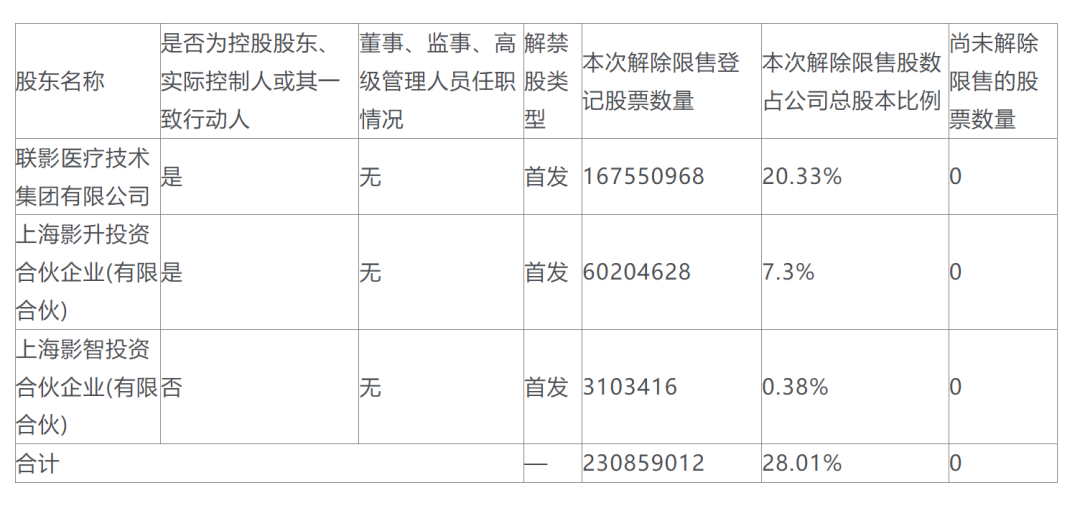 此次解禁涉及的股东包括联影医疗技术集团有限公司、上海影升投资合伙企业(有限合伙)和上海影智投资合伙企业(有限合伙)。