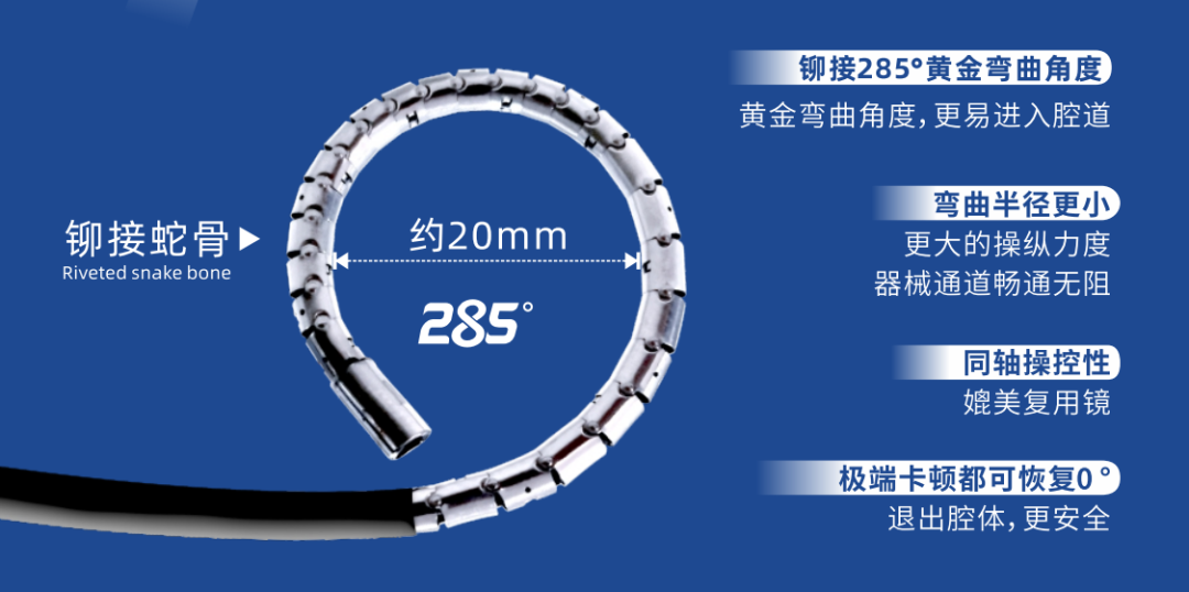 华芯医疗团队具有近二十年的研发生产经验,在安全性上将原本应用在高端复用内镜上的铆接蛇骨设计,应用于一次性内窥镜之上,解决了市面上普遍使用的一体式切割成型蛇骨或一体式注塑蛇骨存在的易变形、寿命短的问题,避免内镜折断脱落造成的医疗事故。