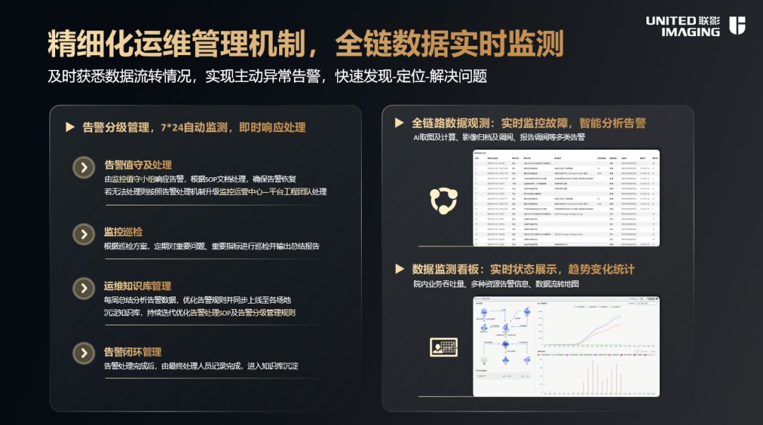 面对传统多厂商系统运维协调难、故障定位慢的问题,AI PACS 革新 IT 系统运维方式,打造「7×24 小时动态运维监控体系」,通过更精细化的运维管理机制,实时观测全链业务数据,联动飞书进行自动告警响应升级通知,确保有运维人员及时响应处理,保障快速发现-定位-解决问题,为医院提供「可靠、可服务、可拓展」的运维新范式,构建更高效的运维保障体系。