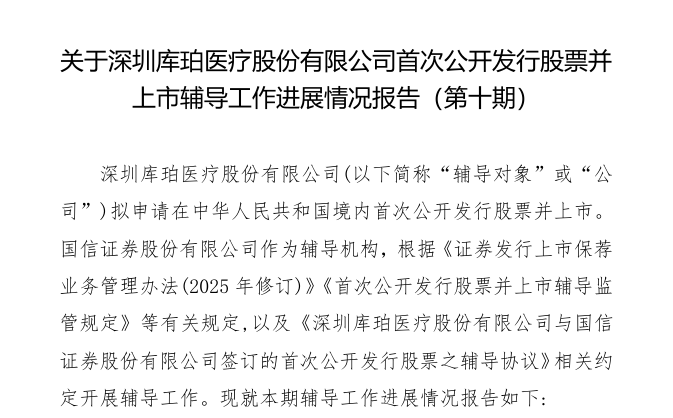 近日,深圳库珀医疗股份有限公司(以下简称“库珀医疗”)披露第十期上市辅导进展报告。