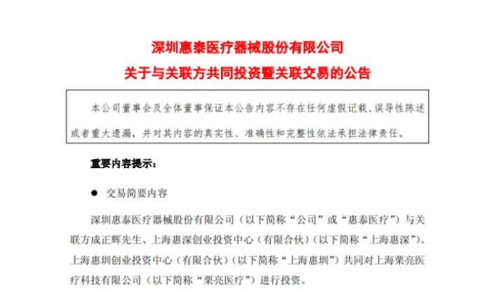 近日,深圳惠泰医疗器械股份有限公司(以下简称“惠泰医疗”)发布公告,宣布与关联方成正辉、上海惠深创业投资中心及上海惠圳创业投资中心共同向上海栗亮医疗科技有限公司(以下简称“栗亮医疗”)投资1500万元,加速布局静脉曲张治疗创新赛道。