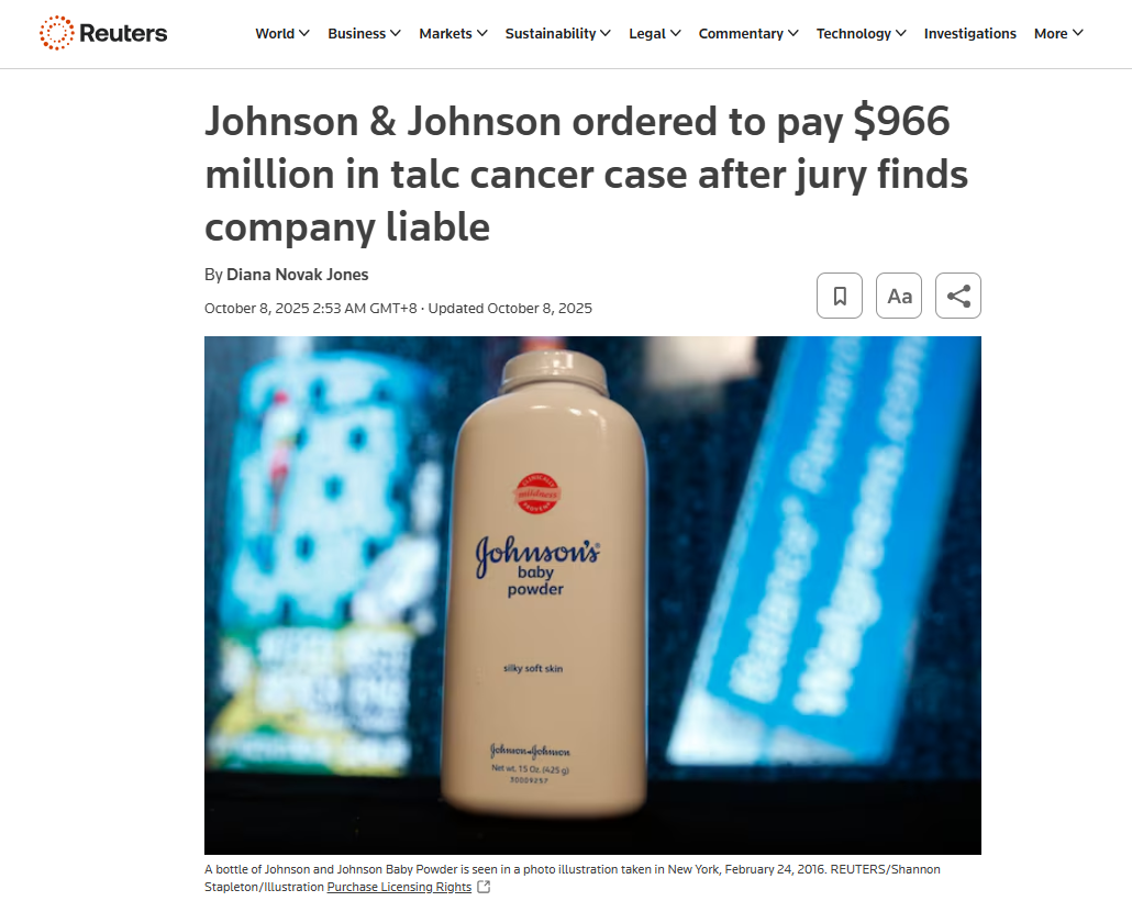 洛杉矶某陪审团已裁定强生公司(Johnson & Johnson)在一桩案件中支付 9.66 亿美元(约合人民币68.8亿元)赔偿金,该案件认为强生的滑石粉基婴儿爽身粉与癌症存在关联。
