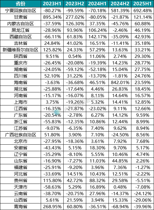 增长与下降突出的省份:宁夏回族自治区(692.48%)、甘肃省(121.14%)、内蒙古自治区(60.88%)同比增速领先;青海省(-39.96%)、山西省(-29.06%)、云南省(-24.12%)则出现明显下降。