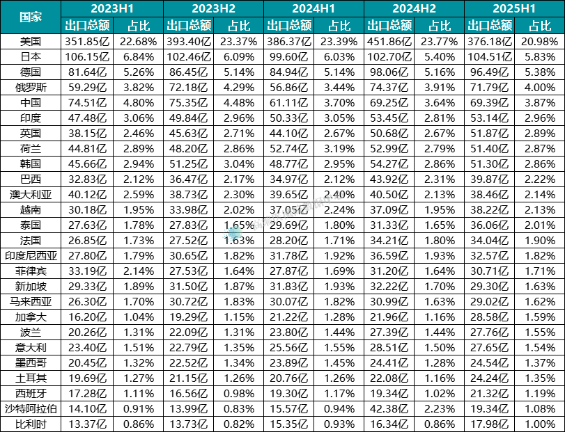 主要出口国家:美国仍居首,新兴市场增长显著