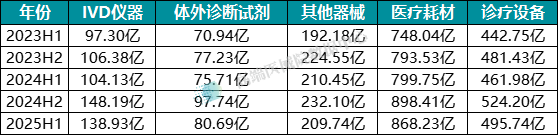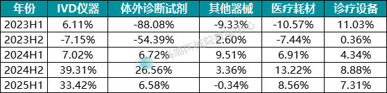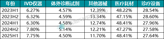 IVD 仪器:成为增长最快的品类之一,出口额从2023 年上半年的 97.30 亿元增至 2025 年上半年的 138.93 亿元,在总出口额中的占比从 6.27% 提升至 7.75%。尤其在 2024 年下半年和 2025 年上半年,同比增速分别达 39.31% 和 33.42%,发展势头强劲。