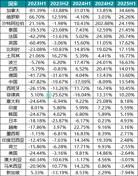 增长领先:加拿大、俄罗斯、沙特阿拉伯成为同比增长最快的国家,其中加拿大增速达34.66%,俄罗斯 26.26%,沙特阿拉伯 24.19%,反映出新兴市场的潜力。