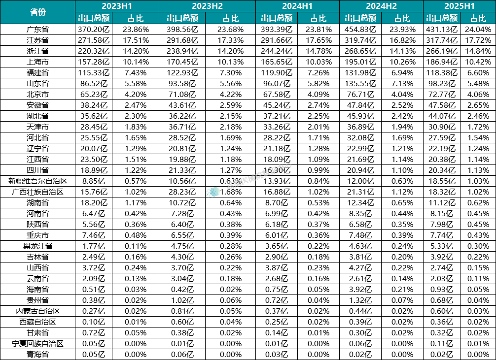 前三省份:广东省(431.13 亿元,占比 24.04%)、江苏省(317.74 亿元,占比 17.72%)、浙江省(266.19 亿元,占比 14.84%),三省份占比结构稳定,同比增长均保持在 8%-10% 之间,表现平稳。