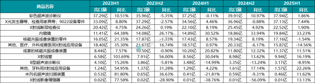 医疗影像领域:内窥镜表现突出,2025 年上半年出口额 19.84 亿元,同比增长 33.23%,成为增速最快的细分产品;而 “其他医疗、外科或兽医用 X 射线应用设备” 同比下降 14.56%,降幅明显。