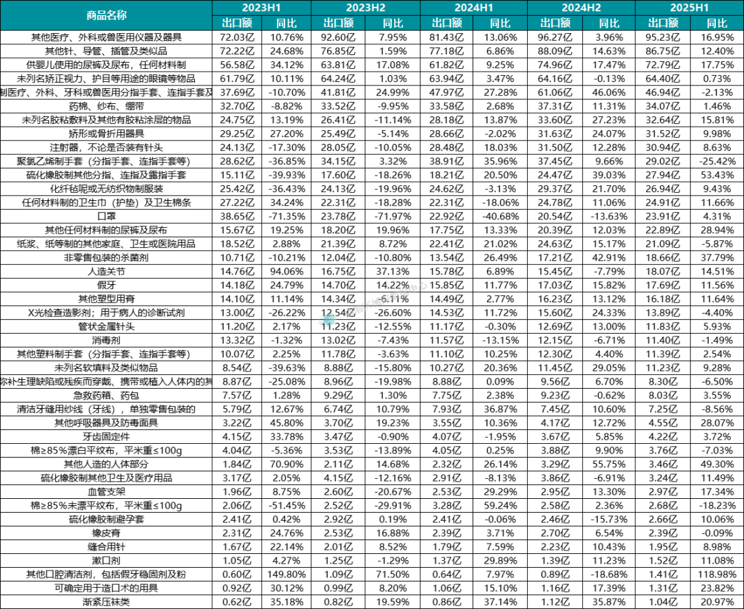 医用耗材作为出口额占比最高的类目,出口仍以低值耗材为主,其中“其他口腔清洁剂(含假牙稳固剂及粉)”“硫化橡胶制分指 / 连指手套”“其他人造人体部分” 同比增幅领先,反映出细分市场的结构性机会。