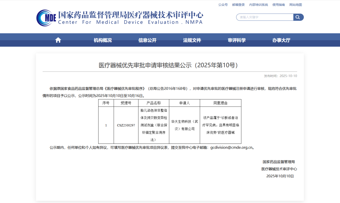 1 | CSZ2500297 | 胎儿染色体非整倍体及拷贝数变异检测试剂盒(联合探针锚定聚合测序法) | 华大生物科技(武汉)有限公司 | 该产品属于“诊断或者治疗罕见病,且具有明显临床优势”的医疗器械 |