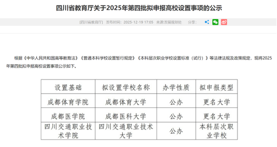 近日,四川省教育厅发布《关于2025年第四批拟申报高校设置事项的公示》,其中明确:成都医学院拟更名为成都医科大学。该公示时间为2025年12月19日至12月25日。