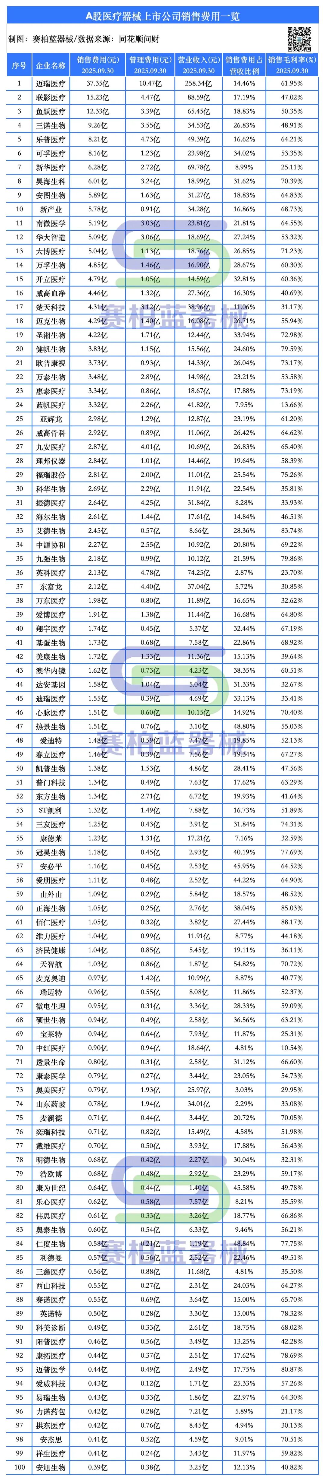 据同花顺问财数据,2025年前三季度,A股医疗器械上市公司销售费用前100企业费用总计为268.20亿元,排名前十的分别是迈瑞医疗、联影医疗、鱼跃医疗、三诺生物、乐普医疗、可孚医疗、新华医疗、昊海生科、安图生物、新产业。