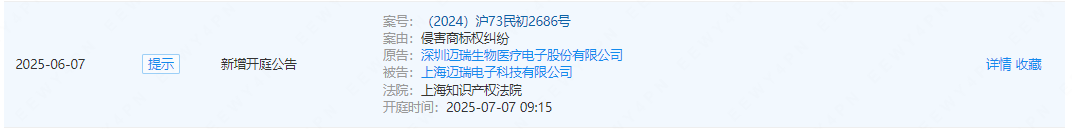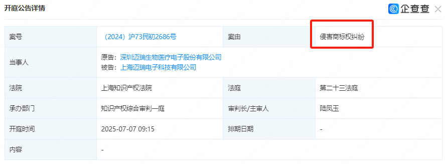 2024年7月,企查查数据显示,深圳迈瑞起诉呼和浩特市迈瑞医疗器械有限公司不正当竞争,呼和浩特市迈瑞成立与2013年,目前参保人数7人,主要从事医疗器械III类、II类的销售。