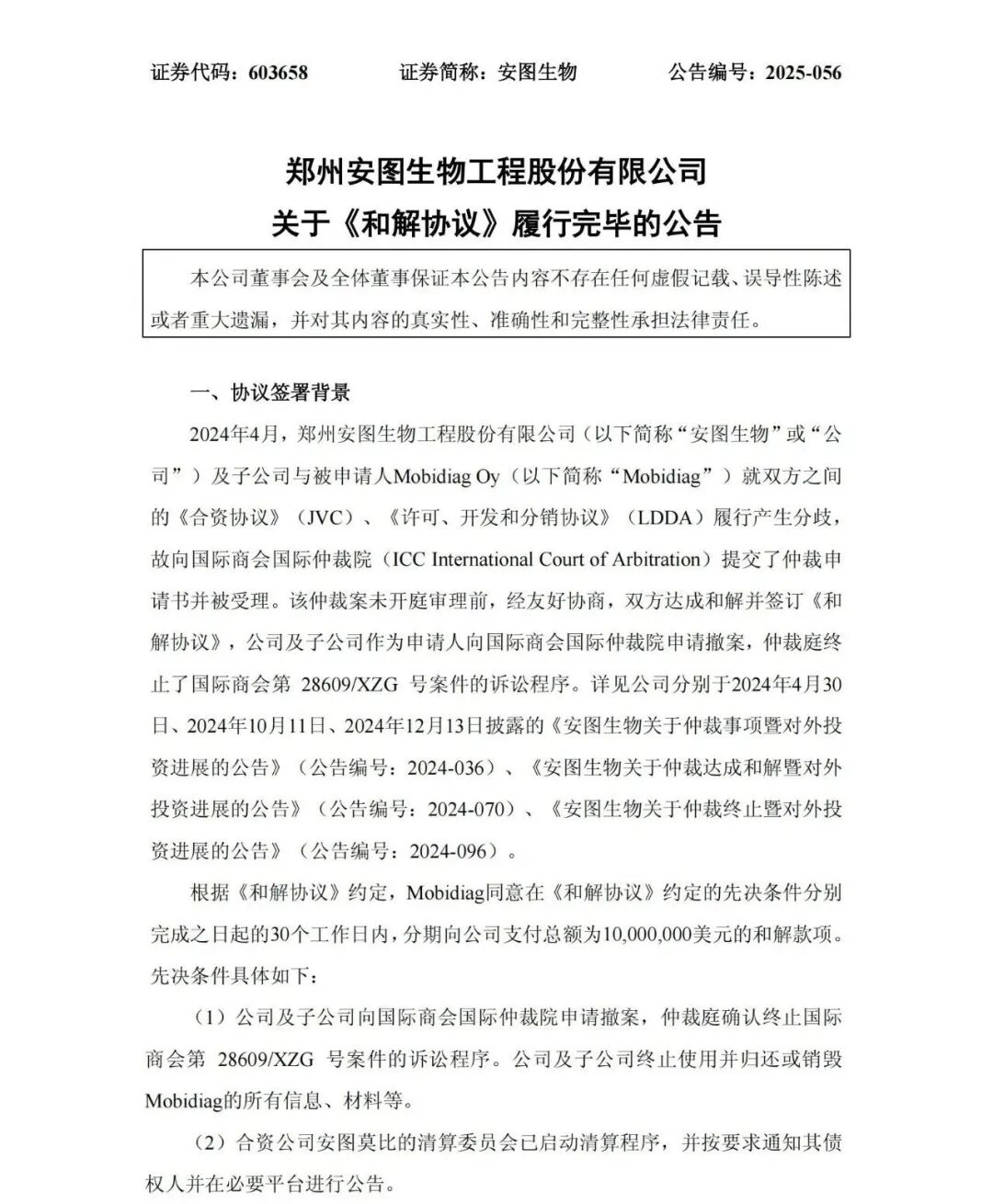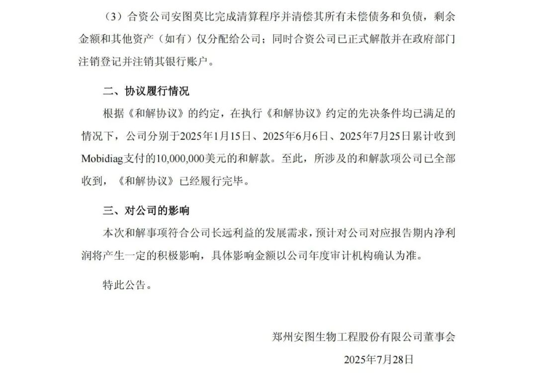 7月28日,安图生物(603658)发布公告,关于《和解协议》履行完毕的情况。公司及其子公司与Mobidiag就《合资协议》和《许可、开发和分销协议》的履行产生分歧,向国际商会国际仲裁院申请仲裁。