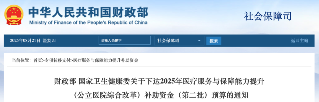 8月20日,财政部发布《财政部国家卫生健康委关于下达2025年医疗服务与保障能力提升(公立医院综合改革)补助资金(第二批)预算的通知》。