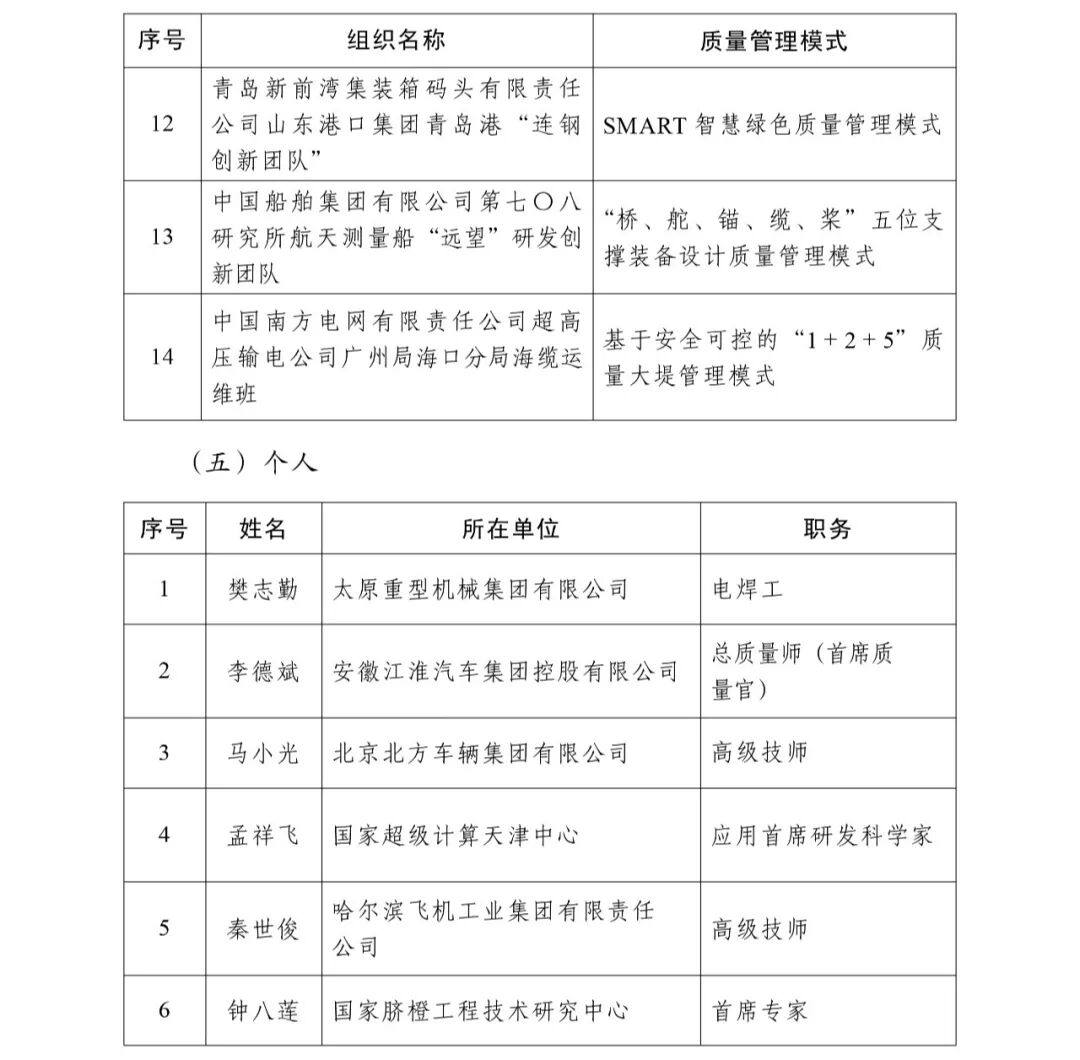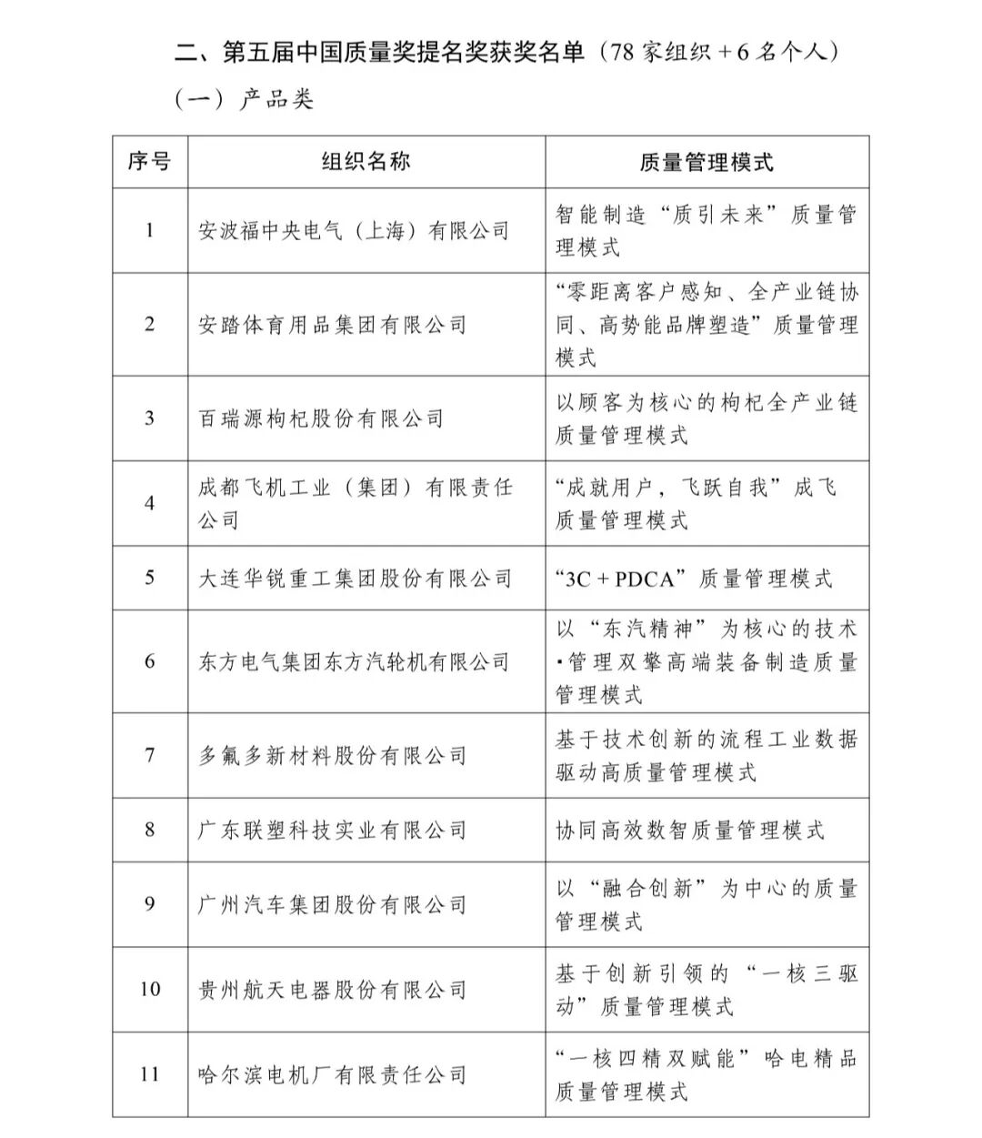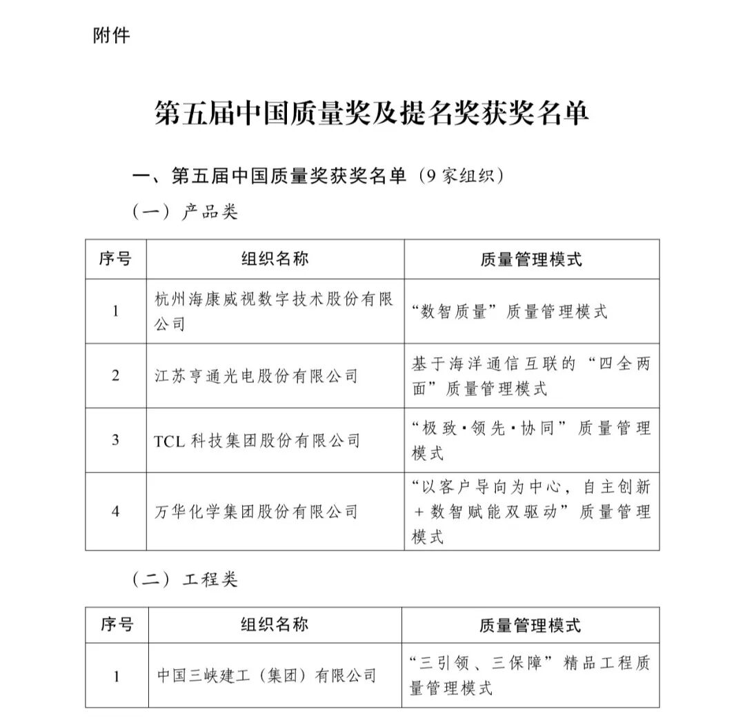9月17日,国家市场监管总局发布《关于第五届中国质量奖授奖的决定》公布了第五届中国质量奖及提名奖获奖名单。
