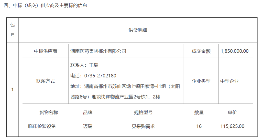 迈瑞16台全自动生化仪中标,单价115625元,总金额185万元。